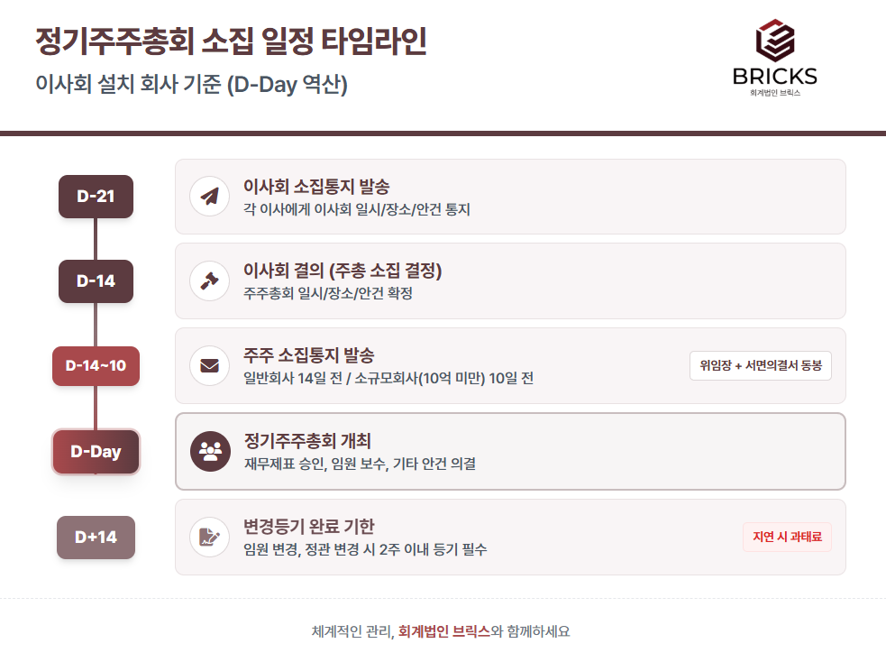 12월 결산 법인이라면 정기주주총회는 3월 말까지 개최해야 합니다. 소집 절차는 이사회 설치 여부에 따라 달라지며, 일정을 역산해서 준비해야 합니다